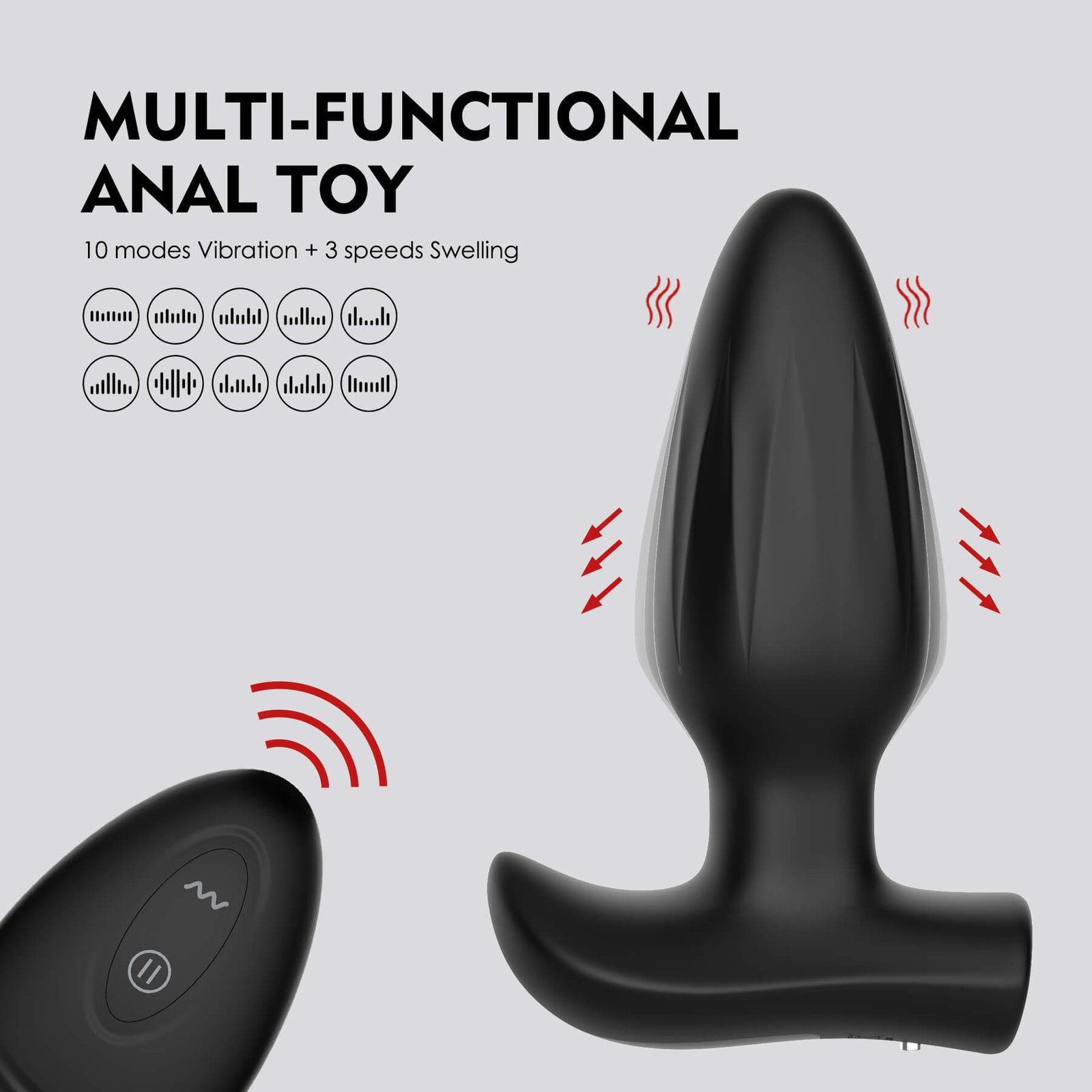 This is a multifunctional anal plug featuring a streamlined body and a T-shaped base at the tail end, ensuring safety and stability during use. The product offers 10 vibration modes and 3 expansion levels, and can be conveniently controlled remotely via a wireless remote control.